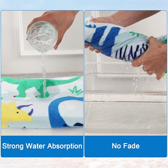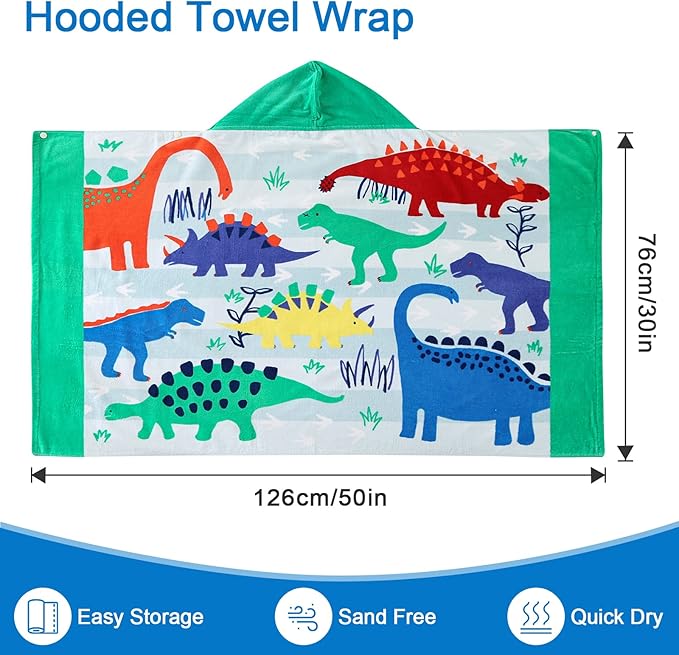- 【Design & Theme】With buttons on front of the soft bath towel, adjustable and more convenient for kids to put on and off. Hooded design on dinosaur beach towel to prevent children from catching cold. Fun themed designs and vibrant colors add even more fun for kids at the beach and in the bath.