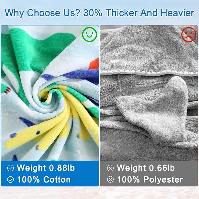 - 【Premium Material 100% Cotton 】Wowelife bath towel is made of 100% cotton, the quick dry beach towel is soft and breathable. Children with delicate skin can also be used with complete confidence. High quality fabric increases the durability of the toddler bath towel. Fade-resistant & no lint, eco-friendly material of UPF50+ rating and national 4.0-8.5 standard.