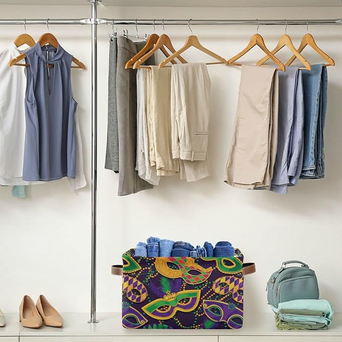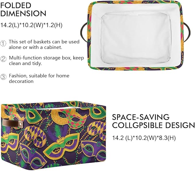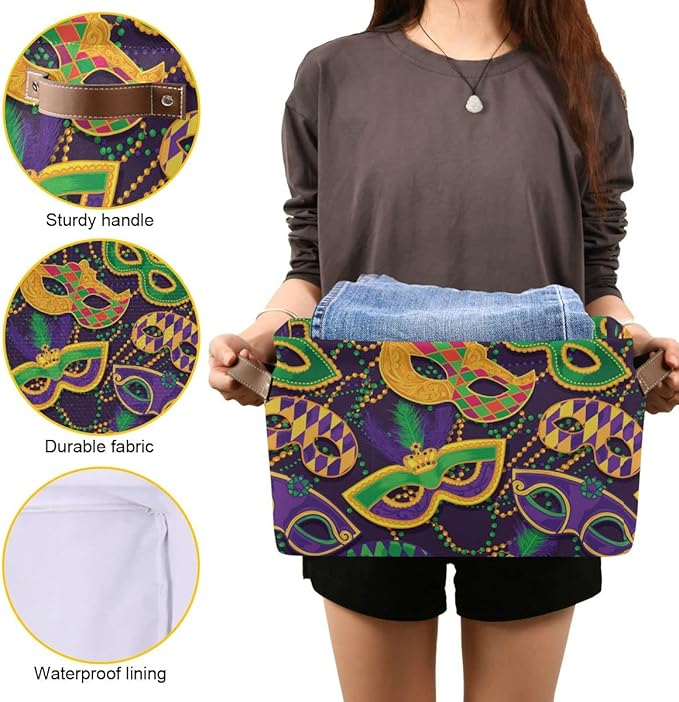 Mardi Gras Accessories Mask Beads Confetti Feather Storage Basket Fabric Laundry Baskets Fleur de Lis Purple Gold Green Storage Boxes Organizer Bag Cloth Toy Book Storage Cubes Shelf Bins 16×12×8
