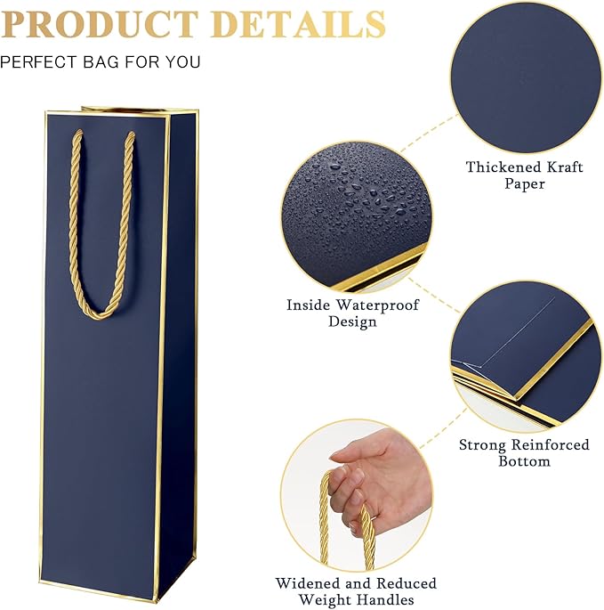 - Quality material: these wine bottle gift bags are made of quality kraft paper for durability, strong and reusable; The lining is covered with a film for a certain resistance to water, while the handle is made of ribbon, strong and not easy to break