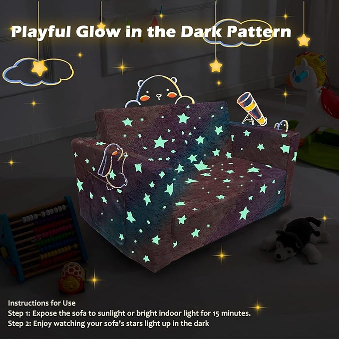 - Glow In The Dark Kids Sofa: Truwelby kids sofa is both a sofa and fold out sofa bed. Expose the glow in the dark kids couch to a bright light or daylight, turn off the lights at night and watch the magic happen! The glow light will create a dreamy atmosphere in your bedroom. It’s just like that you are floating in the universe and surrounded by the stars, incredible and comfortable!