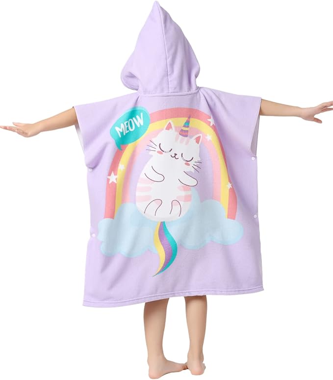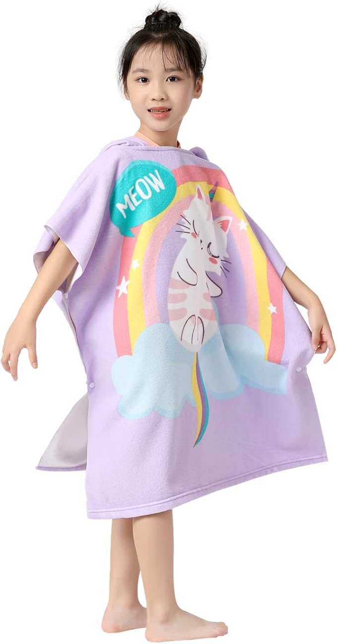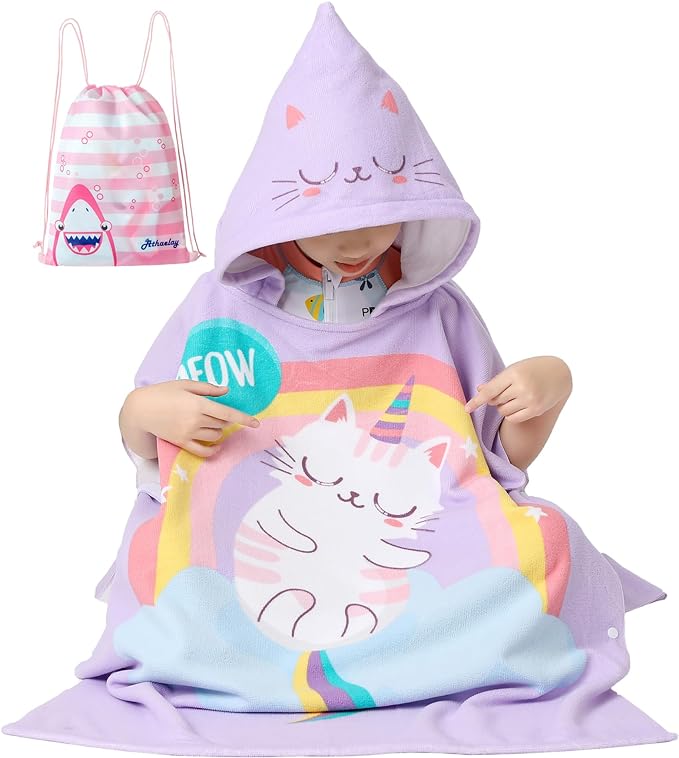 Kid Girls Hooded Towel for Bath Beach, Toddlers Poncho Cover-ups Pool Swimwear, Cat Theme with Drawstring Bag