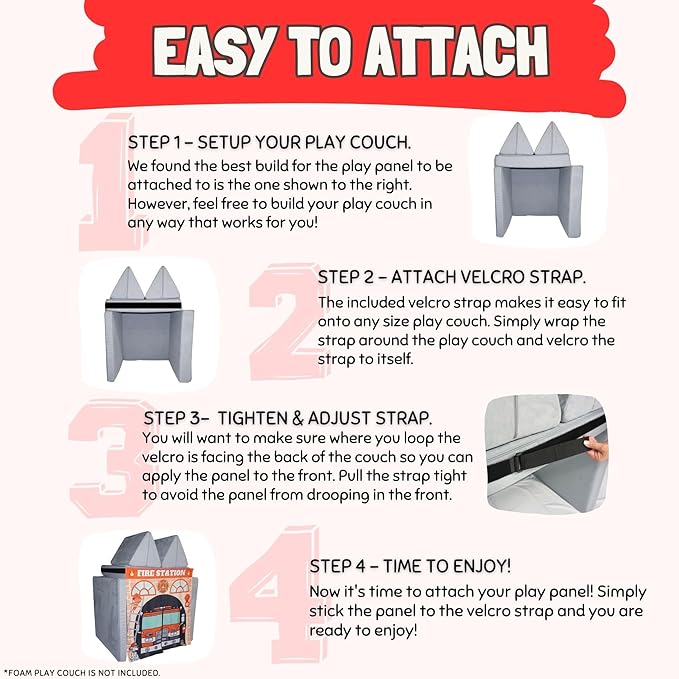 - ADJUSTABLE VELCRO STRAP - Each panel comes with an adjustable velcro strap. The strap makes it easy to wrap around play couches of all sizes. Don't have a play couch? Let your kids use couch cushions to build their forts!