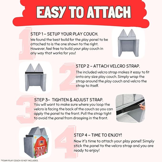 - MADE FOR EVERYONE - No couch? No problem! Our adjustable straps allow you to connect the play panels to any normal couch cushion or chair! **Play couch not included with purchase**