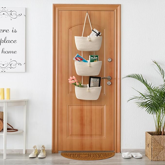 - Large Capacity: The whole woven cotton hanging wall basket measures a total height of 44.5 inches, with each basket-top length: of 14.4 inches; One over-the-door hook and three sticky hooks are prepared for you to hang up the basket