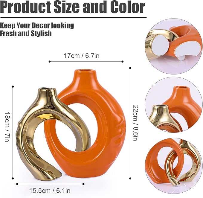 Orange Gold Ceramic Vase Set of 2 for Modern Home Decor,Round Boho Vase for Pampas Grass,Neutral Minimalist Vase for Dining Room Table Centerpiece Dining Room,Wedding Table Decoration