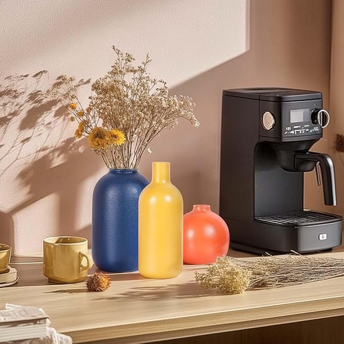 - [Premium Craftsmanship]: Handcrafted from 100% ceramic, each vase in this set is meticulously crafted for long-lasting beauty. These burnt orange, blue, and yellow vases are built to stay fresh and stylish, making them perfect for both modern and rustic fall décor for years to come.