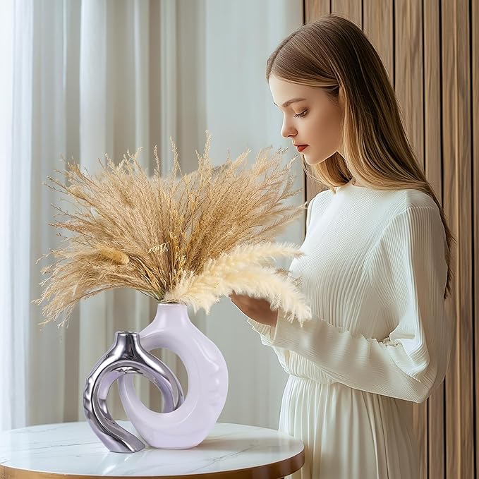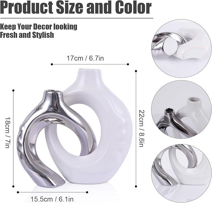 White and Silver Donut Vases, Set of 2, Ceramic Round Modern Vases, Neutral Minimalist Vases for Dining Room Table Centerpiece, Living Room Wedding Table Decoration