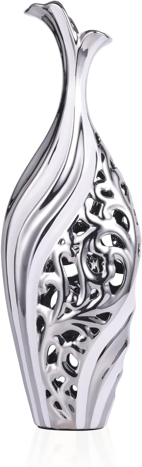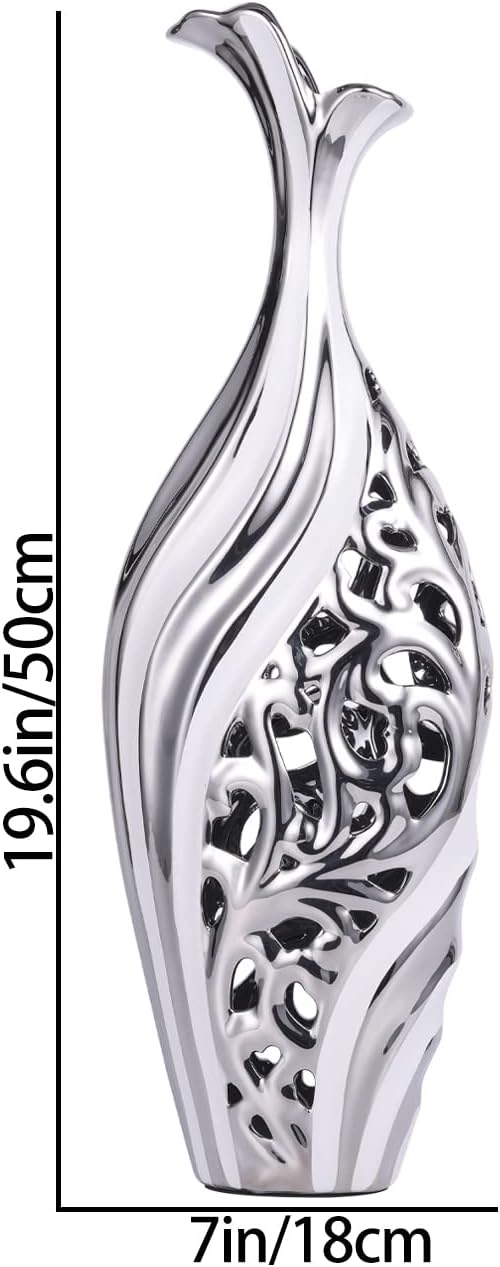 19 inch Floor Standing Large vase, Silver White Ceramic vase, Hollowed Out Large vase, Unique Pampas Grass vase Suitable for Living Room Floor, Home Office, Porch Home Center Decorative Large vase