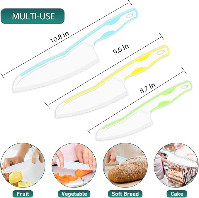 - 【MULTIPURPOSE KID SAFE KNIVES FOR CUTTING】- Our toddler knife can be used to chop vegetables for salads, slice fruits, cut through cheese, soft bread, lettuce, mushroom, and more with ease. Helping kids to get involved with food prep and develop essential kitchen skills. You can even use them to cut baked items(pies or cakes) in your nonstick pan.