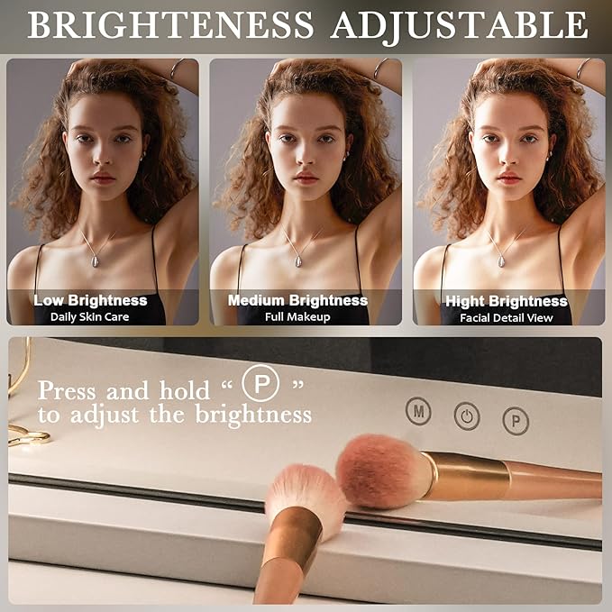 - [Upgraded Adjustable Brightness & 3 colors of light] There are 18 LED bulbs around the vanity mirror, and the 3 adjustable ranges are from cool white to warm yellow (3500-7000K). protecting your eyes.The brightness can be adjusted to meet your personal makeup needs. High lumen and life of more than 50,000 hours. Note: The LED bulb is embedded and cannot be adjusted or replaced.
