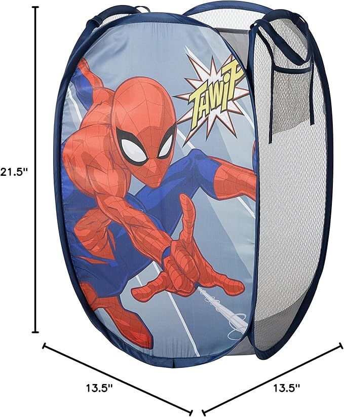 - DESIGN: Pop up hamper featuring Spiderman printed with iconic graphics from the famous brand. This pop up hamper features your child's favorite characters and will make an adorable addition to a bedroom or bathroom décor.