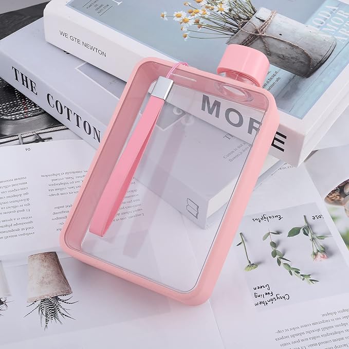 Flat Water Bottle, Portable A5 Water Bottle, 13oz Flat Travel Flask for Camping Fitness Gym (Pink)