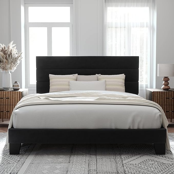 - Minimalist & Noise-Free: King size bed frame with a padded upholstered headboard, suitable for various decors; EVA mute bar prevents noise from friction, no squeaking or creaking