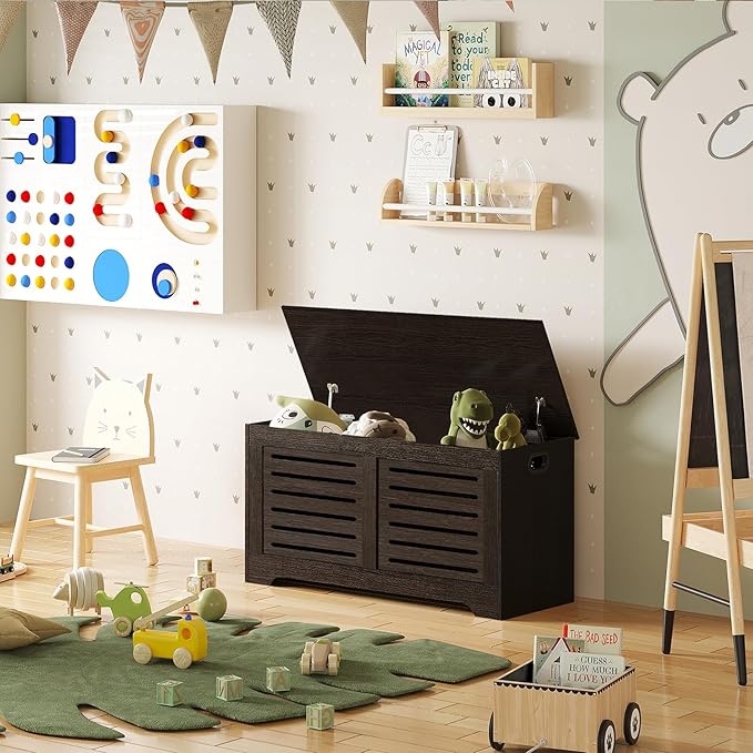 DINZI LVJ Storage Chest, Flip-Top Wooden Toy Box with 2 Safety Hinges, Retro Entryway Shoe Bench, Sturdy Large Storage Trunk for Living Room, Bedroom, Toddler Room, Easy Assembly, Espresso