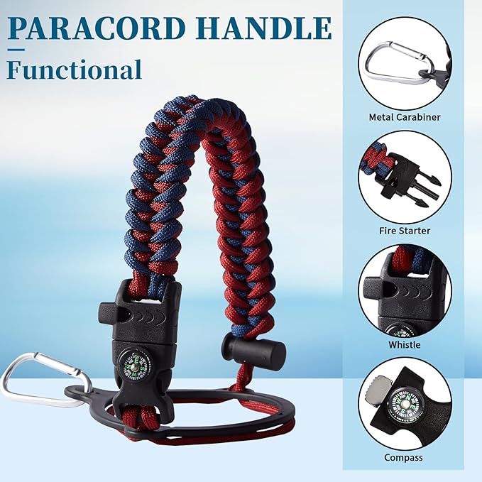 - PERSONALIZATION BOTTLE PARACORD HANDLE - 128oz Insulated water bottle with a pretty cool functional paracord handle which does more than meets the eye.?The survival strap cord is made of military-grade nylon and comes with a compass, safety loop, metal carabiner, flint, igniter, and whistle, making it a functional and stylish addition to your water flask, is perfect for outdoor camping, hiking, fitness enthusiasts