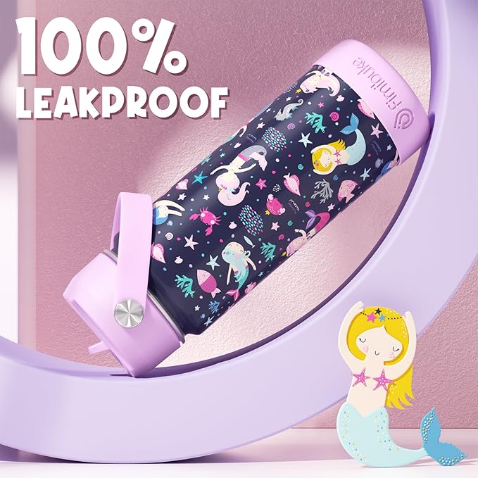 Fimibuke Kids Insulated Water Bottle - 18oz BPA-FREE 18/8 Stainless Steel Kids Cup with Straw Travel Tumbler Double Wall Vacuum Leak Proof Toddler Water Bottle for School Boys Girls(1 Pack, Mermaid)