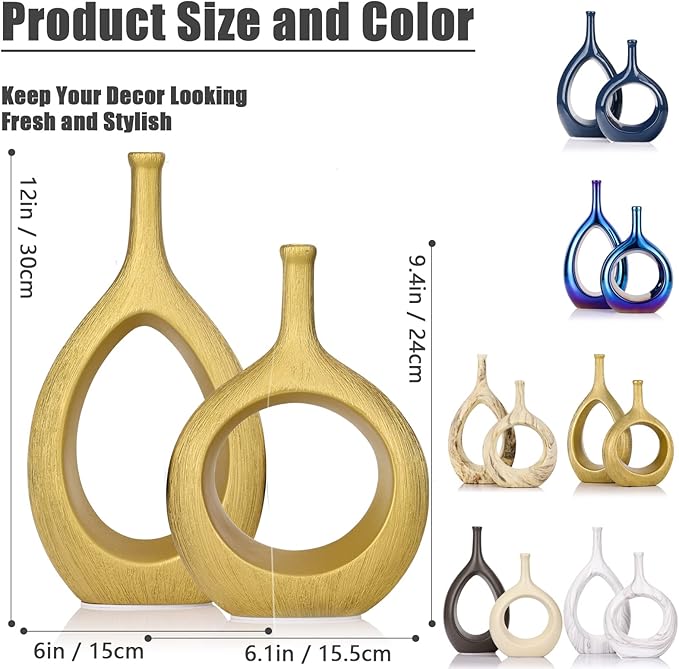 Brushed Gold Ceramic Vase Set 2,Modern Hollow Circle with Hole Flower Vase for Home Decor,for Table Centerpieces,Farmhouse,Fire Place,Living Room,Bedroom,Office,Bookshelf,Rustic Decor