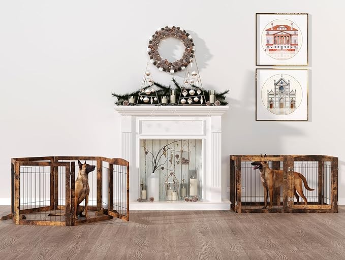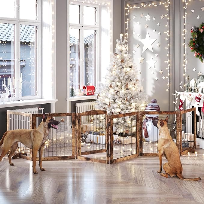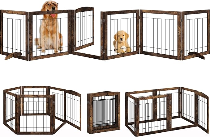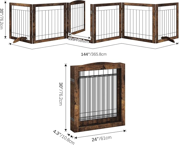 Folding No-Assembly Pet Gate 144" Wide, 30" Tall Wooden Dog Gate with Door Walk Through, Freestanding Wire Pet Gate, Pet Puppy Safety Fence, with 2PCS Support - Rustic Brown
