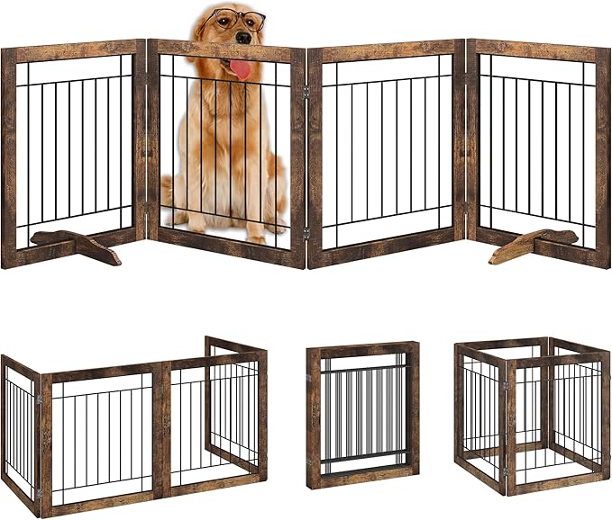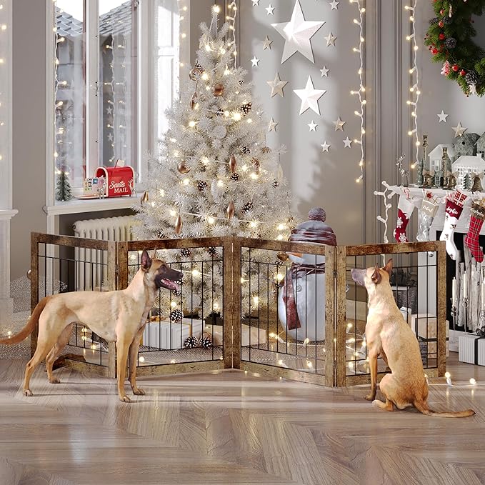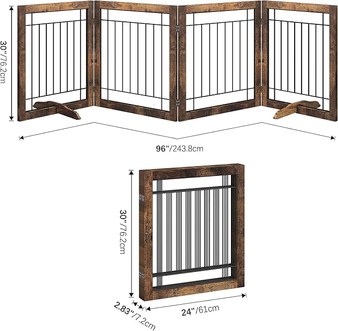 Folding No-Assembly Pet Gate 96" Wide, 30" Tall Wooden Dog Gate, Freestanding Wire Pet Gate, Pet Puppy Safety Fence, with 2PCS Support - Rustic Brown
