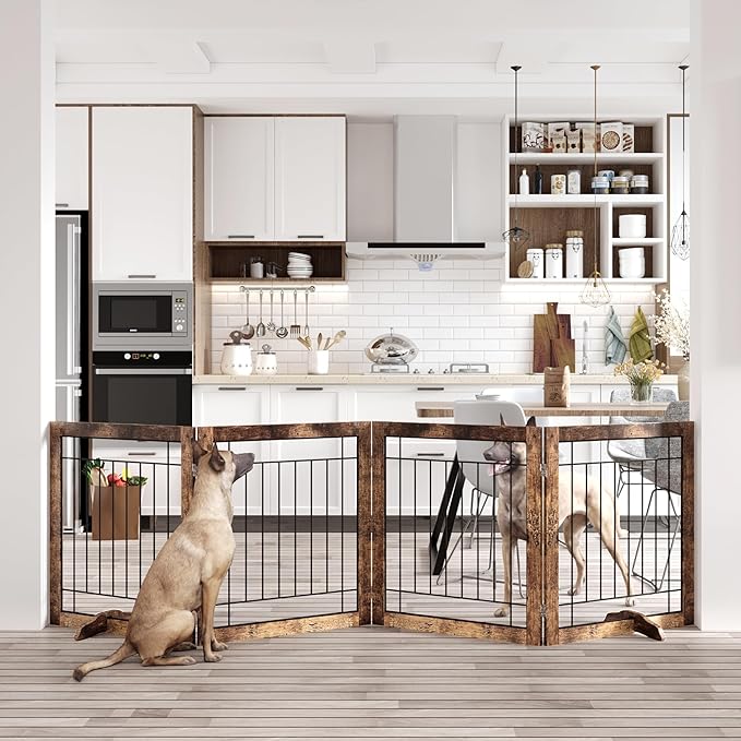 - Tall dog gate folds for storage——The pet gate features an Accordion style design that folds for compact storage when not in use. When folded, this expandable fencing is small enough to conveniently fit in the closet.