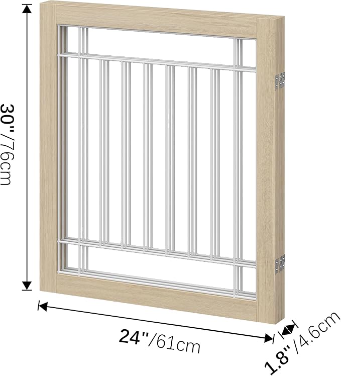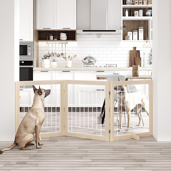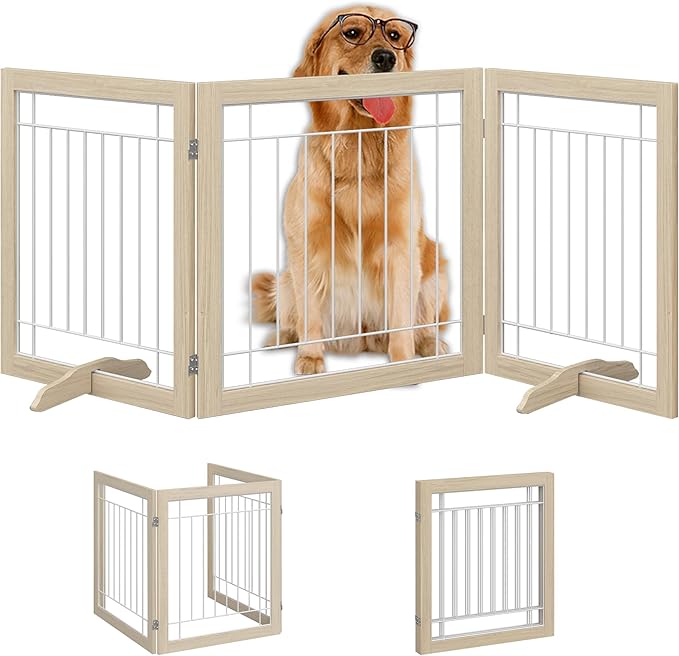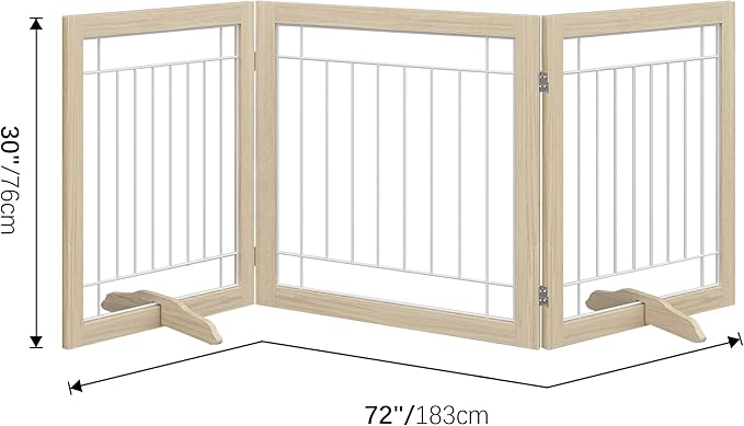 Folding No-Assembly Pet Gate 72" Wide, 30" Tall Wooden Dog Gate, Freestanding Wire Pet Gate, Pet Puppy Safety Fence, with 2PCS Support - Natural White