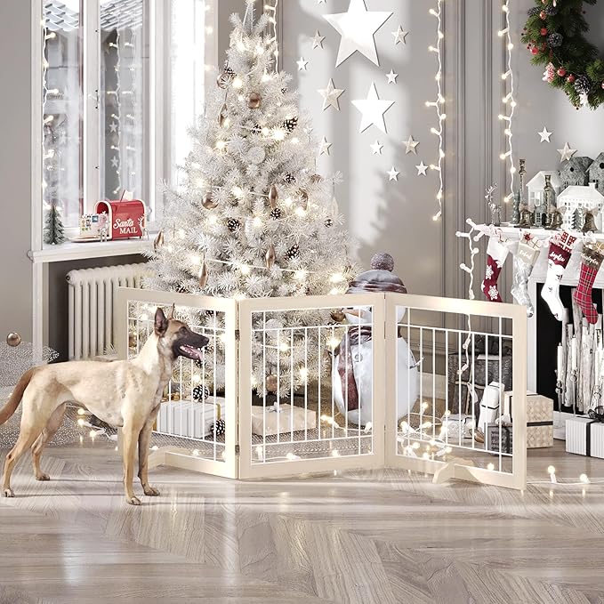- Tall dog gate folds for storage——The pet gate features an Accordion style design that folds for compact storage when not in use. When folded, this expandable fencing is small enough to conveniently fit in the closet.