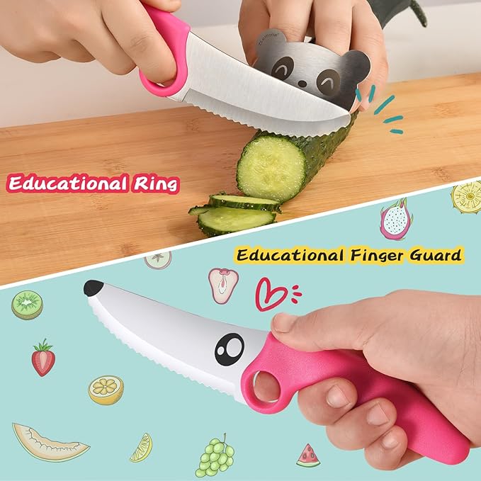 - 【Designed for Training】 The ZLemma Kids Knife features an educational ring incorporated to teach children how to safely grip the knife with their right hand. The accessory-finger guard instructs children on how to securely hold food with their left hand, ensuring their fingers are protected, promoting a confident and secure cutting technique