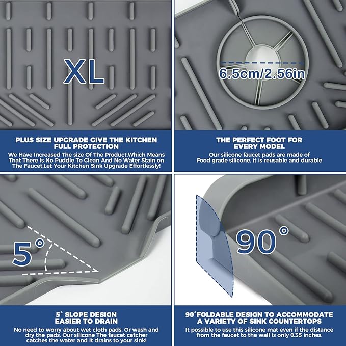 - đȘăPERFECT KITCHEN ACCESSORIESă Using these silicone faucet splash catchers with their grey luxurious, timeless color and seamlessly blends into your home to create perfect Sink Accessories, add a touch of luxury in your kitchen will give your house an amazing makeover and elevate your home decor.