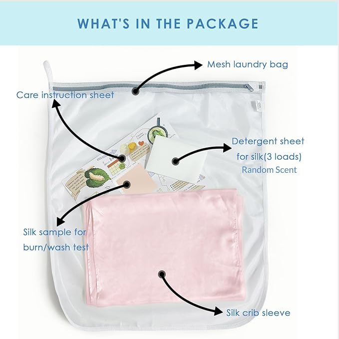 - Easy to Clean - Simply put the silk crib slip into the mesh laundry bag and throw it into the washing machine with 1 load of detergent sheet for silk, wash on gentle cycle in cold water. Mesh laundry bag and detergent sheet for silk are included in package.