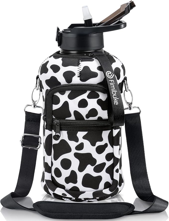 - INSULATED STORAGE SLEEVE: Our water bottle is designed with a high quality 5mm Neoprene sleeve, which not only can protect the water jug from slight bumps, but also keep water cold longer(water bottle is not insulated) and absorb messy sweat to avoid dripping on the table or seat. 2 zipper pocket is designed for storing your phone, card, airpods, etc. Comes with a adjustable & removable padded shoulder strap that can be adjusted from 25" to 50" to offer you more carrying options and hands free.