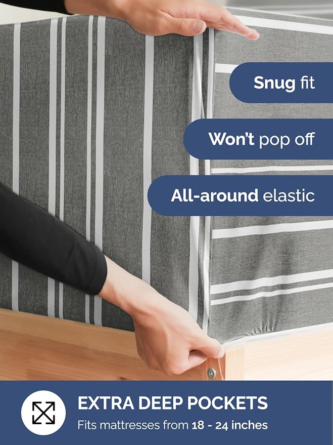 Extra Deep Split King Sheet Set - 7 Piece Breathable & Cooling Sheets - Hotel Luxury Bed Sheets Set - Easy Fit - Soft, Wrinkle Free & Comfy Sheets Set - Grey Striped Sheet Set w/Extra Deep Pockets