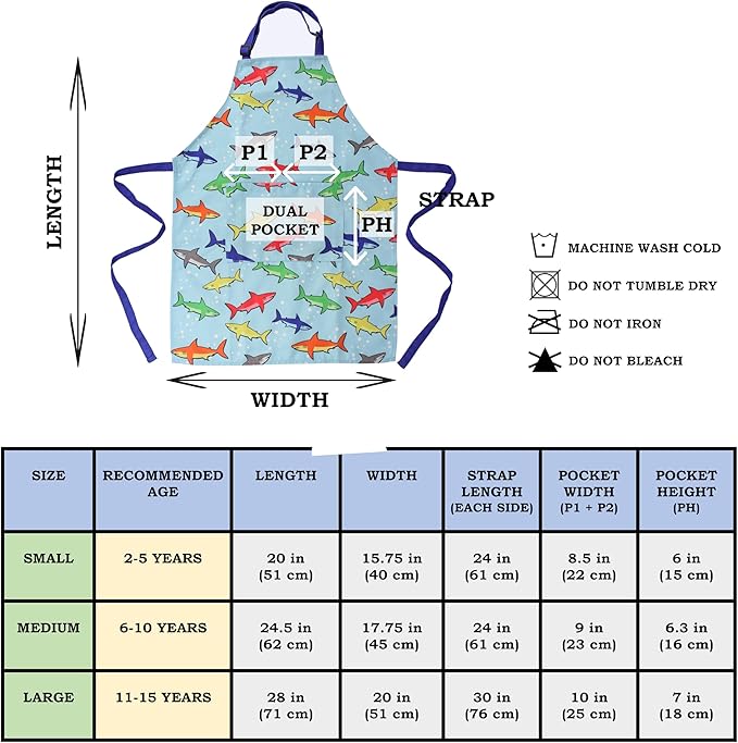 • THREE SIZES FITS KIDS 2-15 YEARS – (Small - 2 to 5 years, Medium – 6 to 10 years and Large - 11 to 15 years). For details about size, refer to the images. Apron features (1) Adjustable neck buckle/strap makes it easy to put on and take off the apron. It also accommodates the needs of a rapidly growing child. (2) Long and sturdy waist tie aids a perfect fit. (3) Dual front pocket provides plenty of room for small tool / tools, accessories, art / craft supplies and keeps hands free.