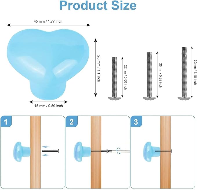 - Color: Blue, Knob Size: 45x28x15mm/1.77x1.1x0.59inch; Each heart ceramic cabinet knob comes with 3 different sizes of screws. The kid's dresser knob is a new way to spice up a boring closet and bring a lively flair especially into the children's room.