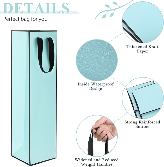 - Strong and Durable: wine bottle gift bags are made of quality kraft for durability, strong and reusable; The lining is covered with a film for a certain resistance to water, while the handle is made of ribbon, strong and not easy to break