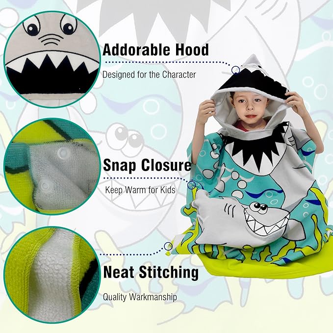 - 【Free Kids' Hands 】This kids hooded beach towel is oversized design. Kids will love how easy this hooded beach towel is to put on and easily use their hands while being covered compared to other hooded towels. There're 2 snaps on each side. It works like a poncho for after the pool/bath/beach rather than a regular beach towel. Takes the hassle out of drying kids off with a towel dragging on the ground!