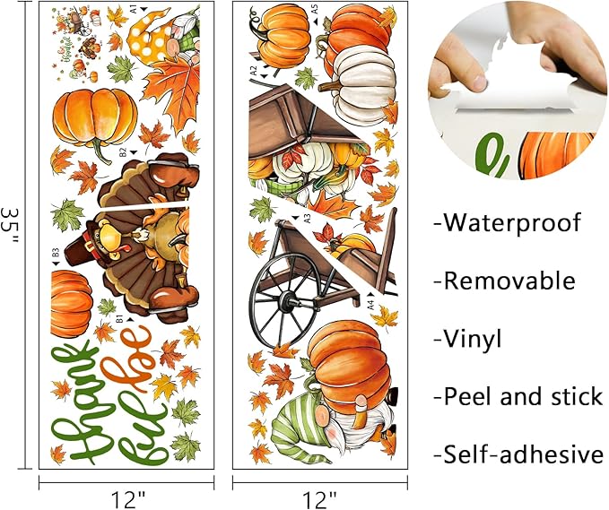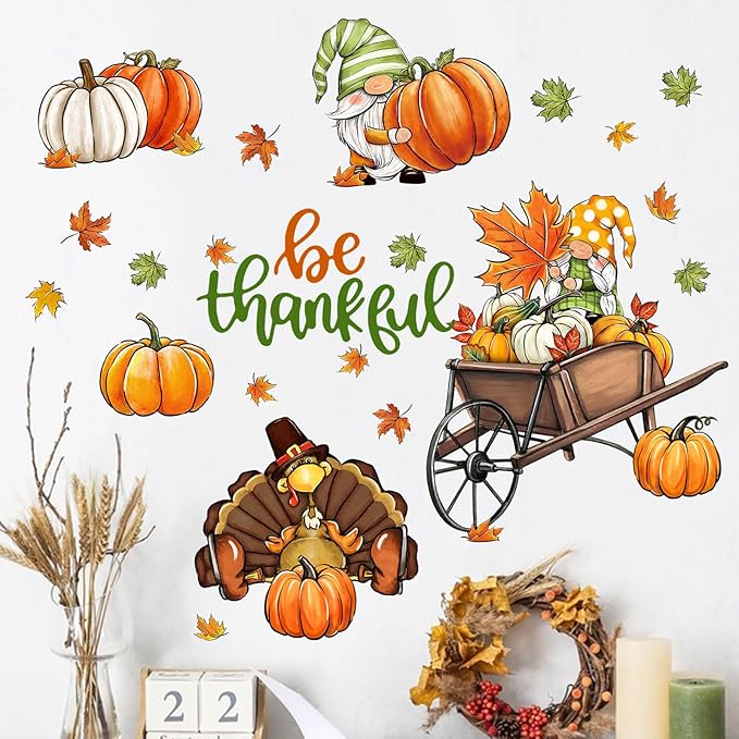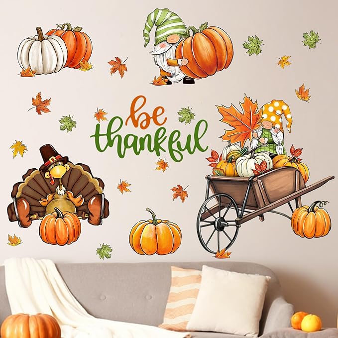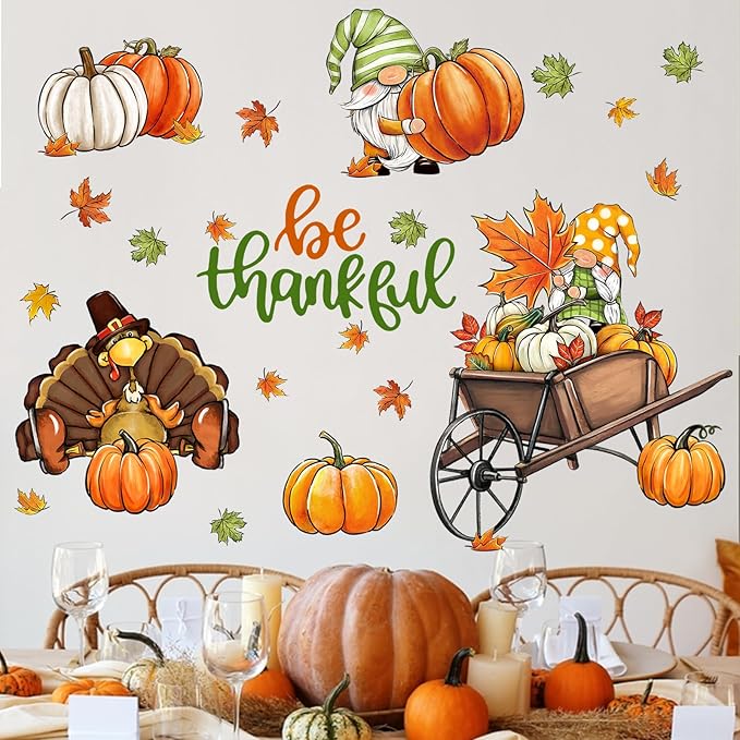 - Thanksgiving Decorations: Our grateful wall decals are designed with various vivid patterns like cute gnomes, gobble turkey, maple leaves, colorful pumpkins and cart. These wall decals and stickers are suitable for bedroom, living room, kitchen, bathroom, patio, farmhouse, retail store, restaurant, coffee house and Thanksgiving party supplies. Perfectly DIY a magic space for your home and office in fall and autumn season