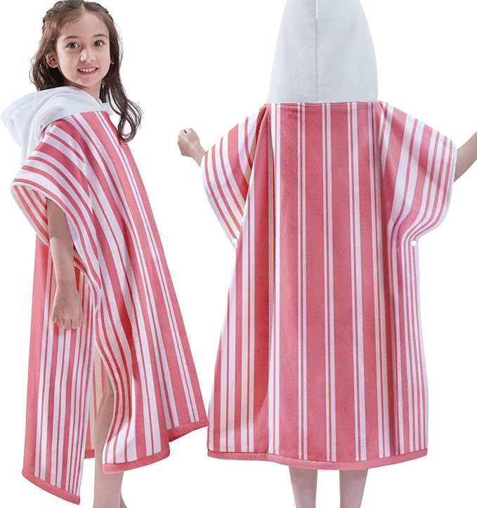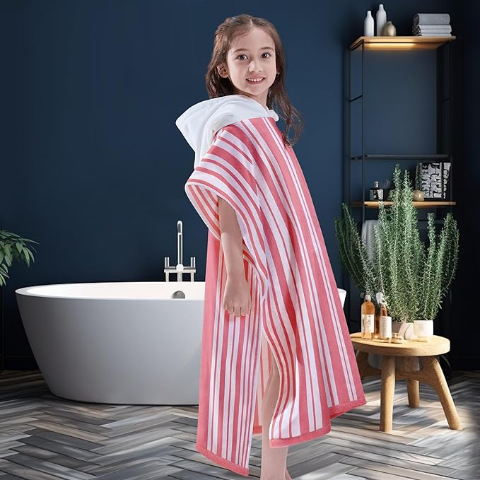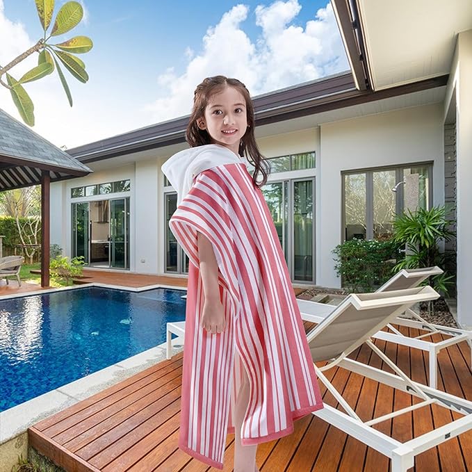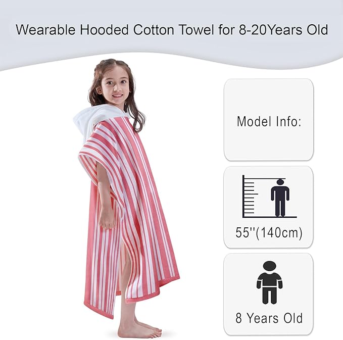 VOOVA & MOVAS Big Girl | Teens Towels with Hood (8-16Years), Large Thick and Absorbent Cotton Hooded Pool Towel Robe- Versatile for Pool, Swim, and Bath, Pink and White Cabana Striped