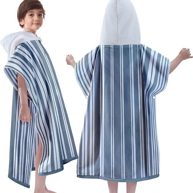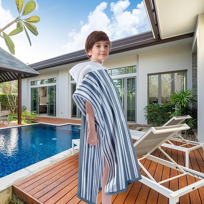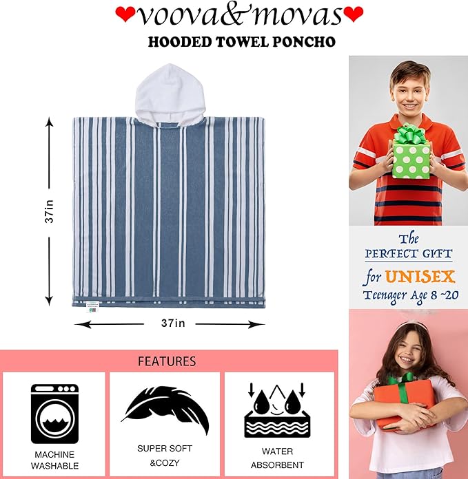 VOOVA & MOVAS Hooded Beach Towels for Boys| Girls | Teens (8-16Years), 100% Cotton Thick Poncho Towel Robe for Kids, Perfect for Pool, Beach, Bath and Gifts, Grey Cabana Stripe Design