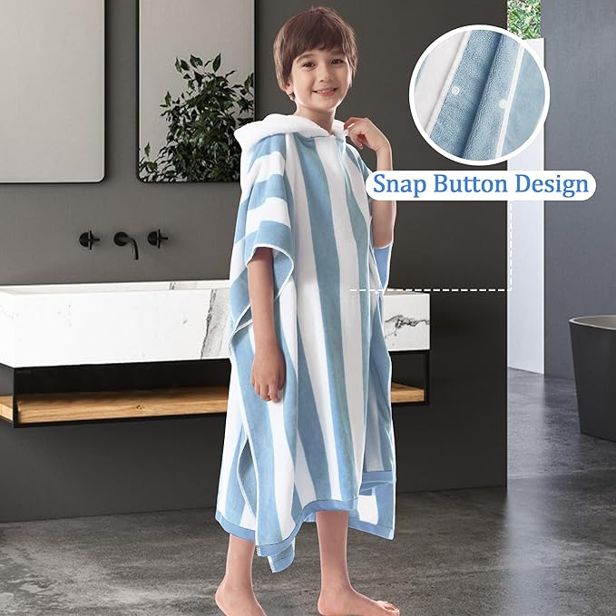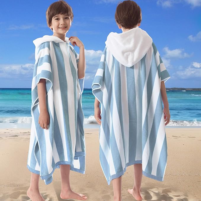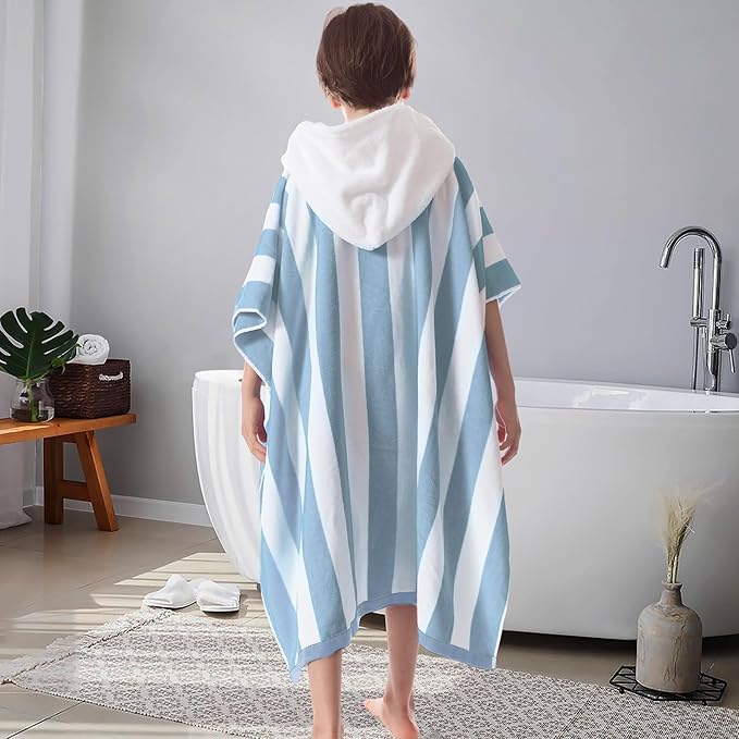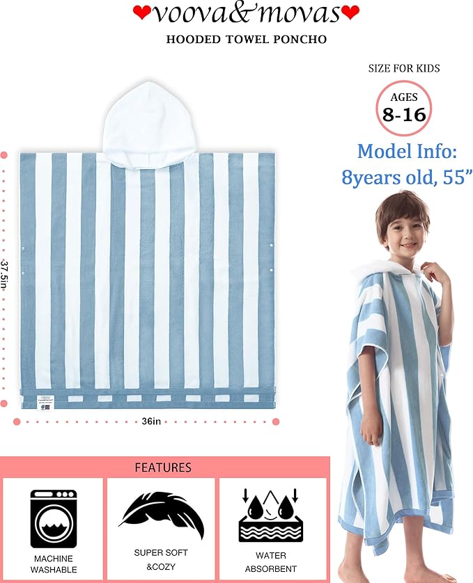 VOOVA & MOVAS Oversized Hooded Beach Towels for Teens (8-16Years), 100% Cotton Thick Absorbent Poncho Towel Robe, Perfect for Pool, Beach, Bathroom, Blue Cabana Stripe Design