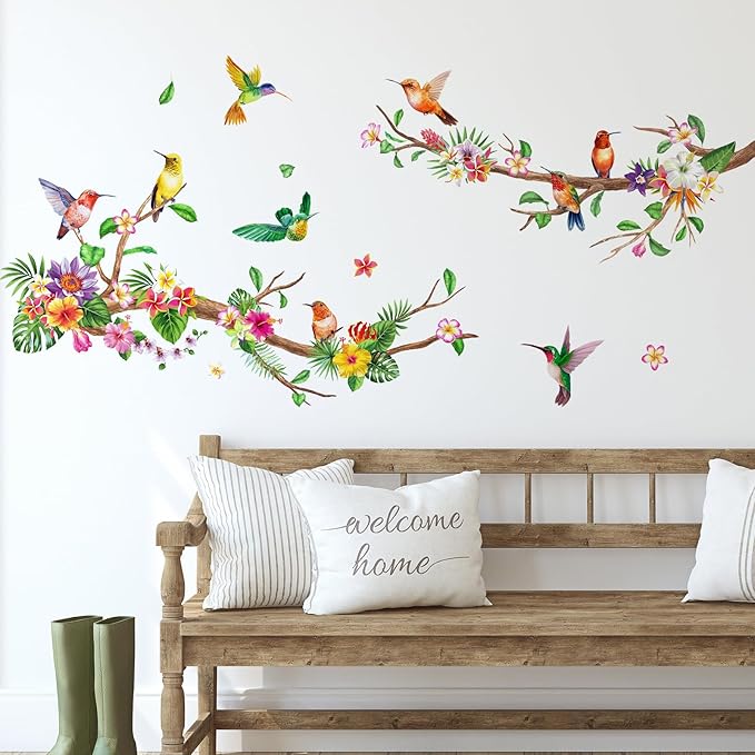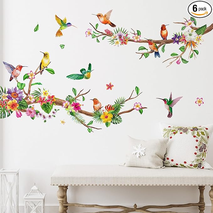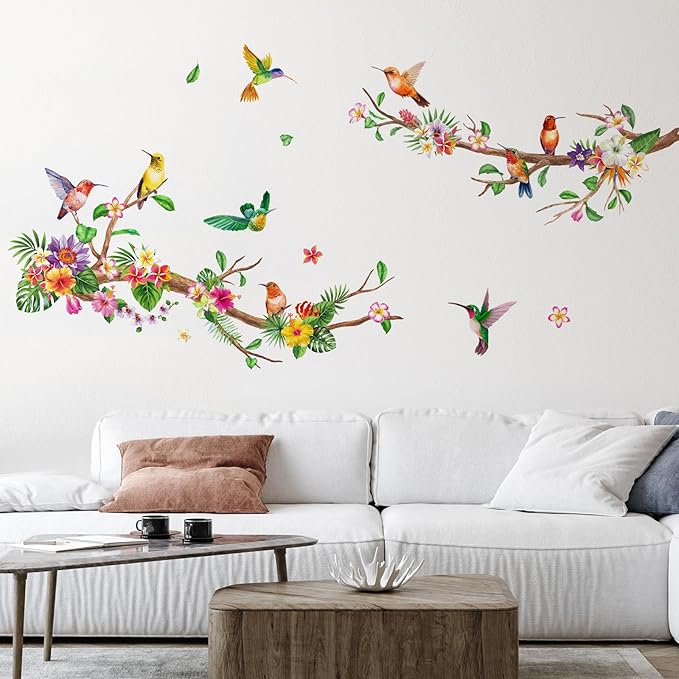 Zonon Flowers Wall Decals Vinyl Dragonflies Flowers Wall Stickers Removable Floral Wall Murals Peel and Stick Colorful Flower Wall Decor for Bedroom Living Room Nursery(Hummingbirds)