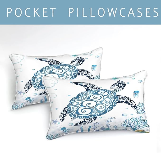 Bedbay Sea Turtle Comforter Set Coastal Bedding Set Turtle Printed 4 Pcs Beach Bedding Quilt Set Coral Blue Underwater World Duvet Set Girls Teen Sealife Ocean Comforter Bedroom Decor(Coral,Queen)