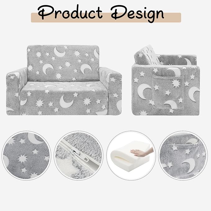 - Desgin & Size: The size of the sofa is17 x 30x 11 inches which typically tailored to fit the needs of children, offering a cozy and age-appropriate seating and sleeping space. Our couches feature playful and kid-friendly designs include popular Stars and Moon glow in the dark .