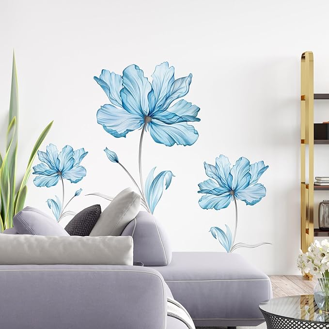Zonon Flowers Wall Decals Vinyl Dragonflies Flowers Wall Stickers Removable Floral Wall Murals Peel and Stick Colorful Flower Wall Decor for Bedroom Living Room Nursery(Blue Flower)