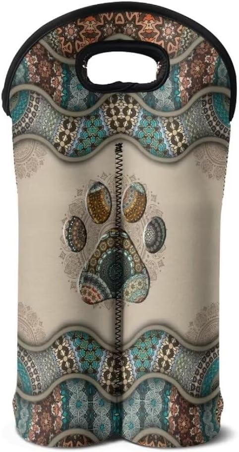 doginthehole 2 Bottle Wine Carrier Travel Bag Boho Dog Paw Print Thick Insulated Neoprene Wine Tote Portable Champagne/Water Bottle/Beer/Drinks Carrying Bag for Travel, Picnic, Party