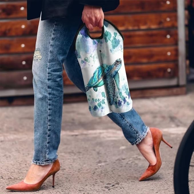 doginthehole Sea Turtle Wine Carrier Tote Bag 2 Bottle Insulated Neoprene Wine/Water Bottle Holder for Travel with Handle, Aqua Animal Print Wine Bags Bottle Protective Carriers Beer Bottle Sleeve