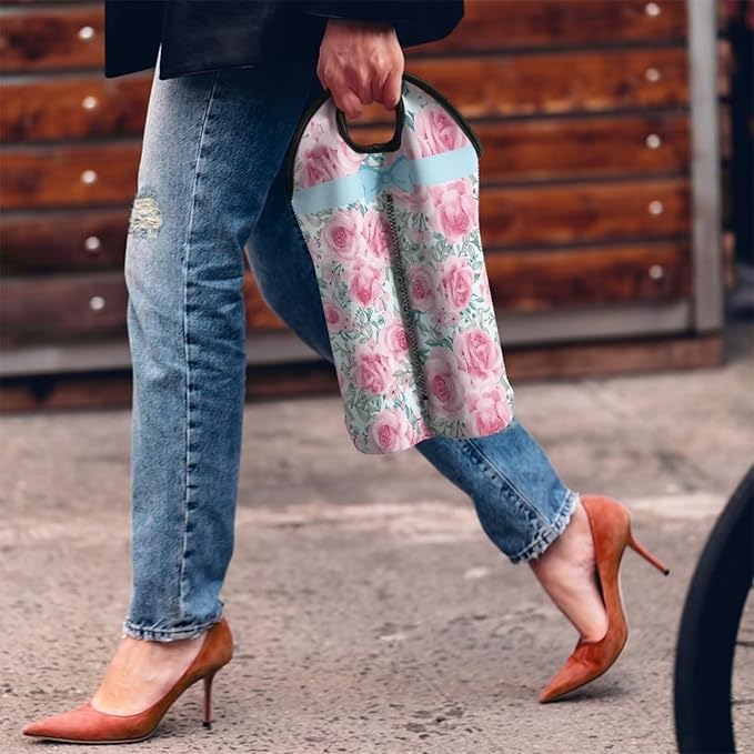 doginthehole Pink Rose Wine Bag Portable Neoprene Wine Tote Holders 2 Bottle Wine Carrying Bag Wine Bottle Covers Champagne Bottle Protector Bag for Home Travel and Picnic, Gift for Wine Lover