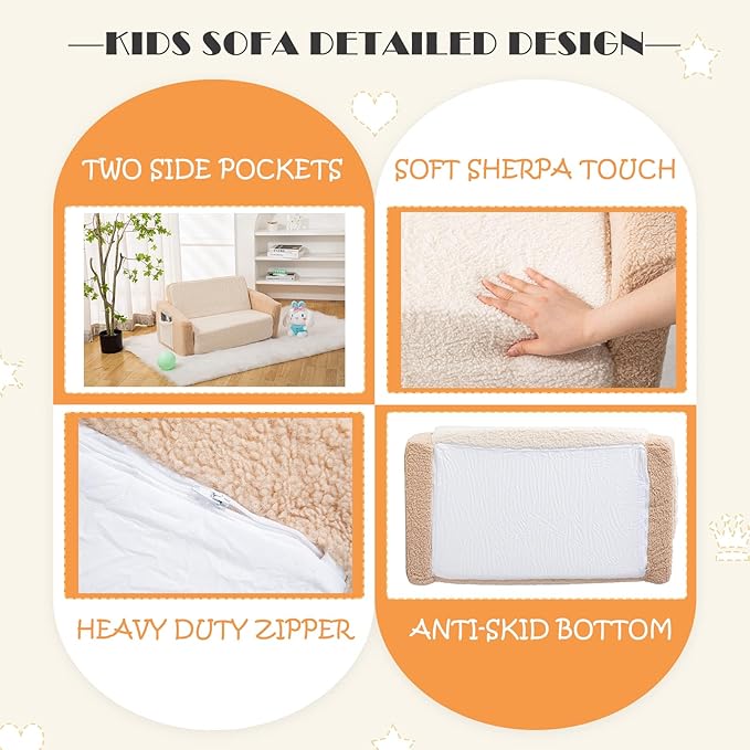 Baby Toddler Sofa Couch for Kids Extra Wide 2-in-1 Toddler Sherpa Fold Out Couch Bed for Playroom, Pull Out Children Convertible Sofa to Lounger for Boys & Girls with Double Pockets, Khaki-Cream