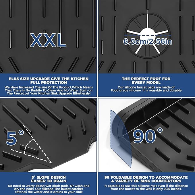 - đȘă5° UPGRADE VERSIONă Silicone sink faucet mat with upgraded 5° slope design and upgraded 0.79" (2 cm) thickness, the kitchen faucet splash guard allows captured water to flow into the sink faster, resulting in faster drying of the kitchen sink. This means never gets soggy, or not having any water spots by the sink faucet. You don't need to worry about the water staying on the sink & bathroom counter. Upgrading your kitchen sink & bathroom countertop in an effort-saving way!