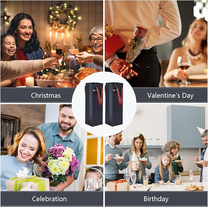 Wine Bags, 12 Packs, Strong Card Paper Wine Gift Bag with Ribbon Handles and Thank You Card, 4-3/8x 4 x 14 Fit 750ml Wine Bottle or Champagnes - Black 12